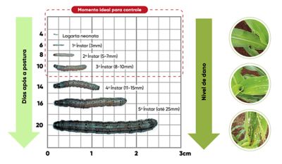 Lagartas até o terceiro ínstar causam danos menos severos, caracterizados principalmente por raspagens foliares, e apresentam maior suscetibilidade às estratégias de controle.