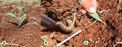 Figura 3 - Danos iniciais de lagarta-do-cartucho em milho: (A) lagarta atacando o coleto da planta; (B) sintoma de “coração morto”; (C) raspagem na base da plântula | Fotos: José Madalóz, 2025.