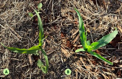 Figura 4 - Comparação visual do estabelecimento inicial do milho aos 14 DAE: (A) com Dermacor® e (B) sem Dermacor® | Fotos: Thiago Prado, 2025.