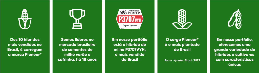 Somos a Pioneer®, uma marca da Corteva Agriscience, que há mais de 50 anos, leva para você, agricultor brasileiro, sementes de alto padrão para atender as necessidades de cultivo específicas da sua região.