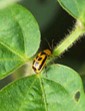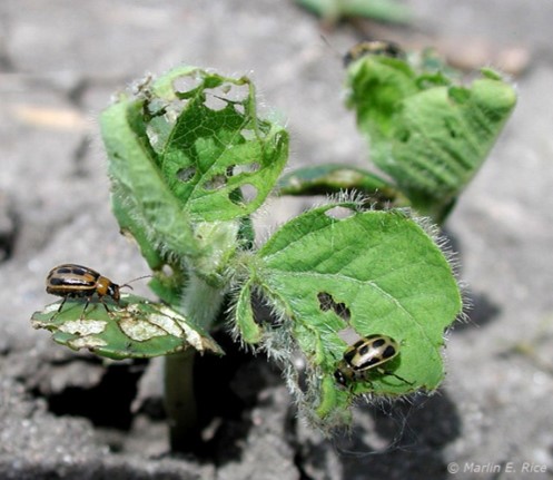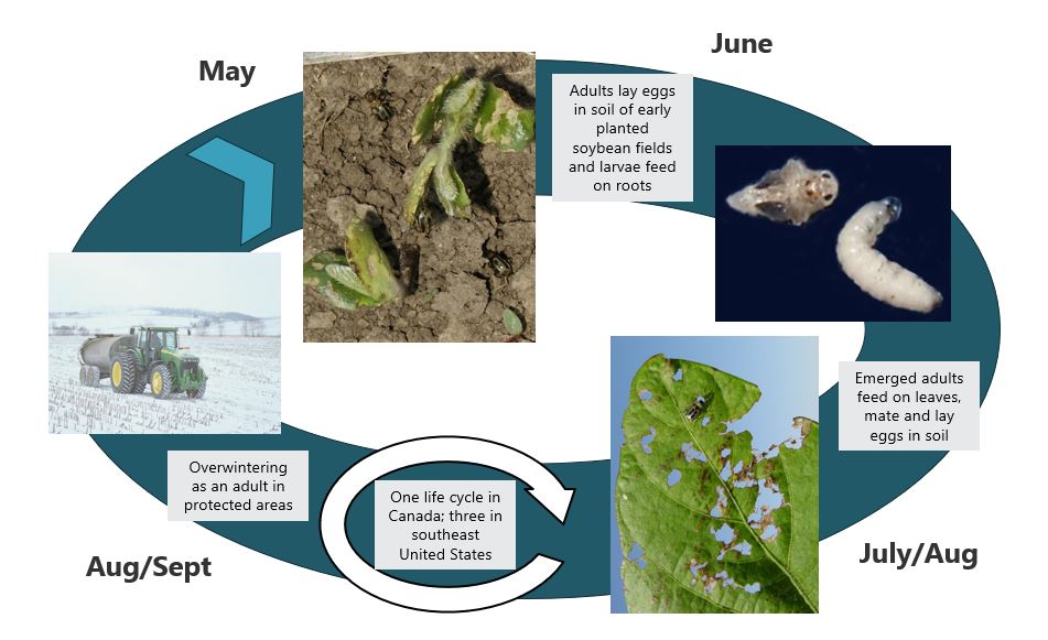 Although the larvae feed on soybean roots, most damage occurs from adult feeding on foliage or pods