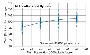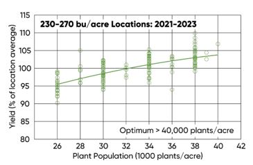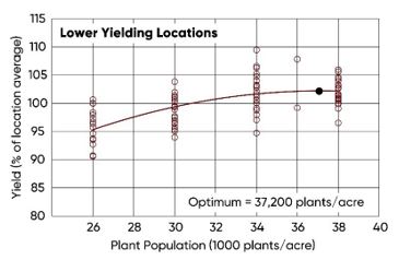 - As was the case across all locations, the optimum plant population for the higher yielding subset of locations was above the highest population in the study of 38,000 plants/acre (Figure 2).