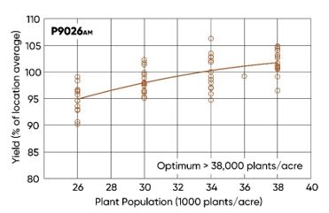 - The optimum plant population for P9026AM was above the population range of the study (>38,000 plants/acre) (Figure 4).
