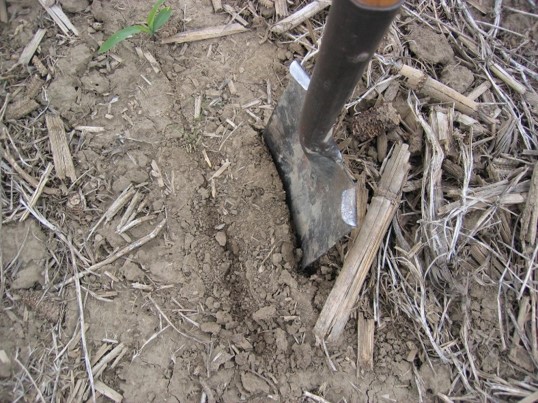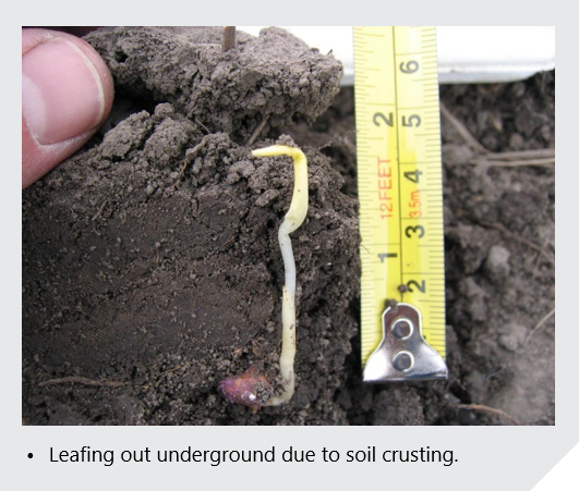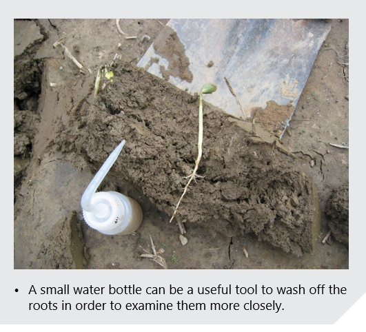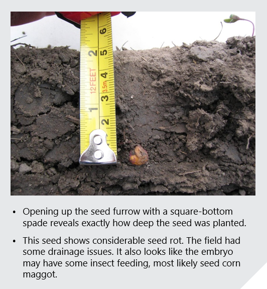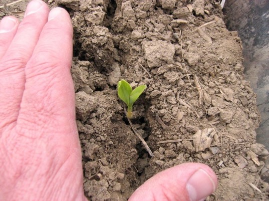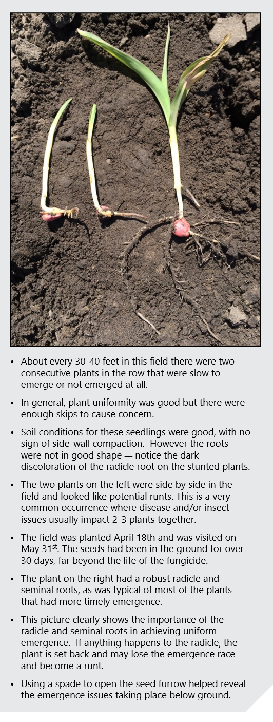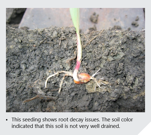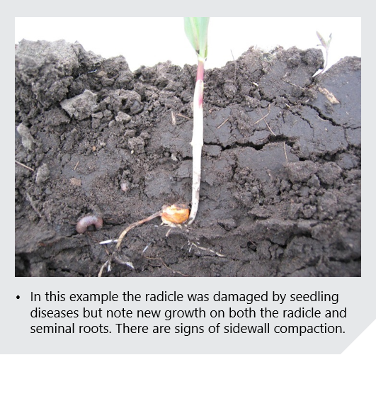 This plant has restricted root growth due to the side wall compaction. The roots are also showing some seedling diseases. This combination of factors has slowed the growth of this emerging seedling.