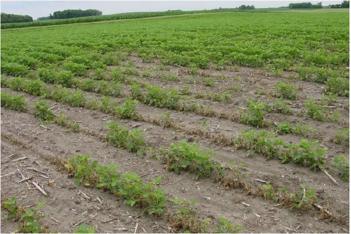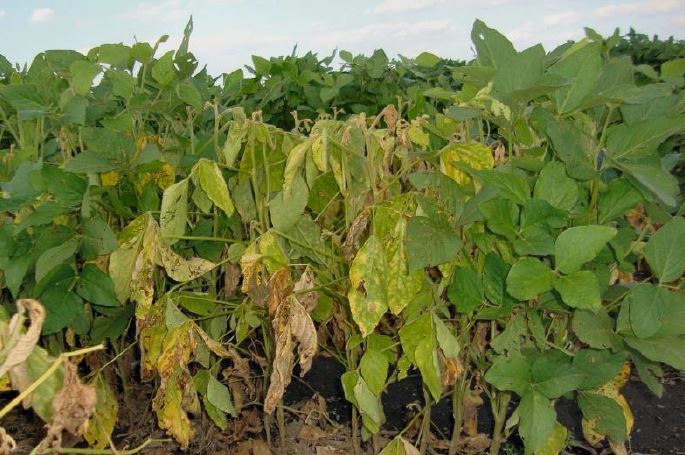 Soybean plants wilting due to Phytophthora root and stem rot.