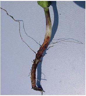 Symptoms of Rhizoctonia root rot. Note the red discoloration.