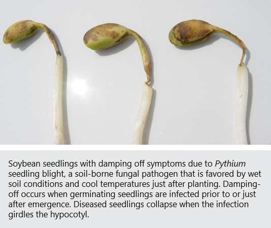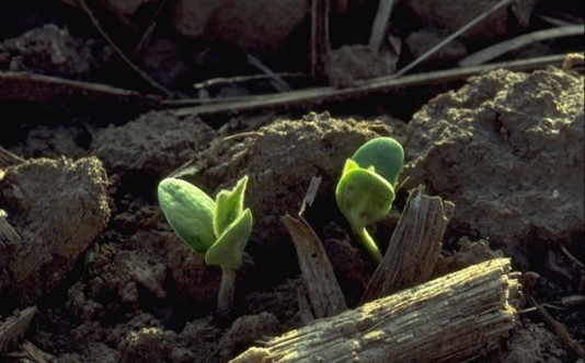 Just-emerged soybean plants damaged by frost. The cotyledons are still green and look healthy, but the region of the hypocotyl just below the cotyledonary node is turning brown and is becoming soft and shrunken.
