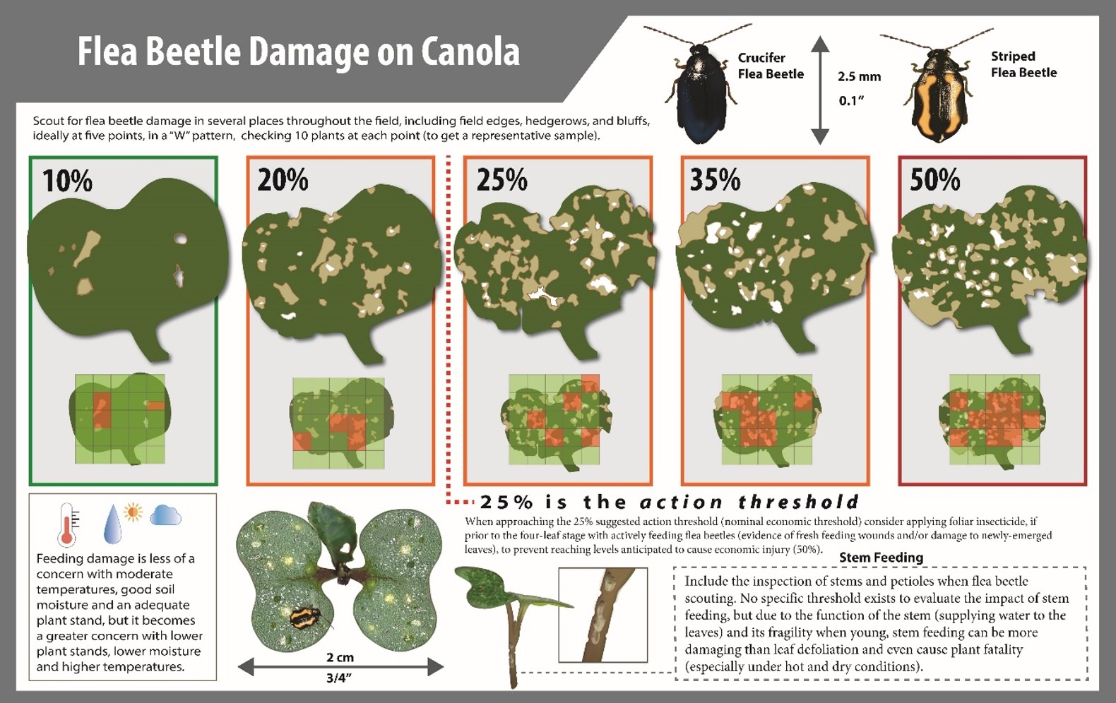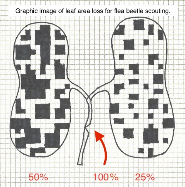 Figure 3. Image representing 25% and 50% leaf area loss due to flea beetle feeding. When stem is clipped, loss is considered to be 100%. Courtesy of the Canola Council of Canada (www.canolacouncil.org)