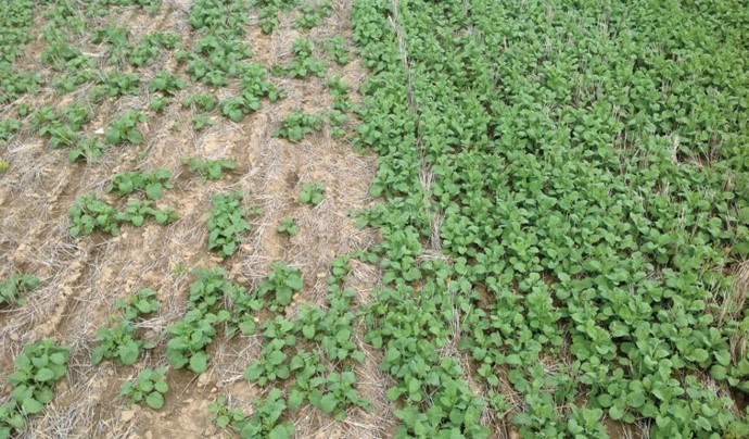 Figure 5. Standard canola seed treatment (left) compared to standard seed treatment plus Lumiderm™ insecticide seed treatment 42 days after seeding (right). Seven Persons, AB.