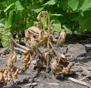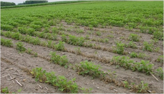 Foliar symptoms of fusarium wilt. Photo by Daren Mueller, Iowa State University, Bugwood.org