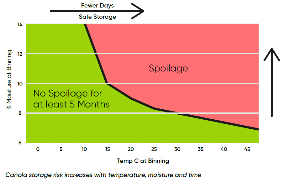 When it comes to safe storage in canola, it’s all about maintaining stability. This means lower moisture levels and lower temperatures to protect the high value of your harvested crop. To maintain the optimal quality of canola seed, it should be stored at 8% moisture and 10°C for long term storage canola is considered dry at 10% moisture.