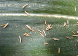 Figure 4. Corn anthers and pollen grains on a leaf. Anthers drop off of the tassel once their pollen has been released.