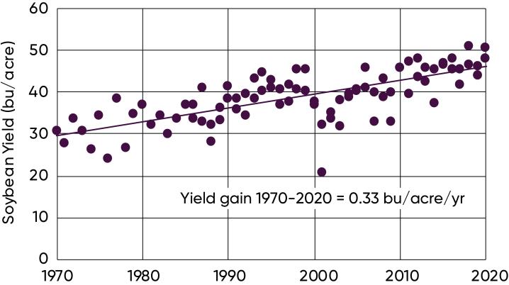 Figure 1. Ontario and Quebec average soybean yields 1970-2020.