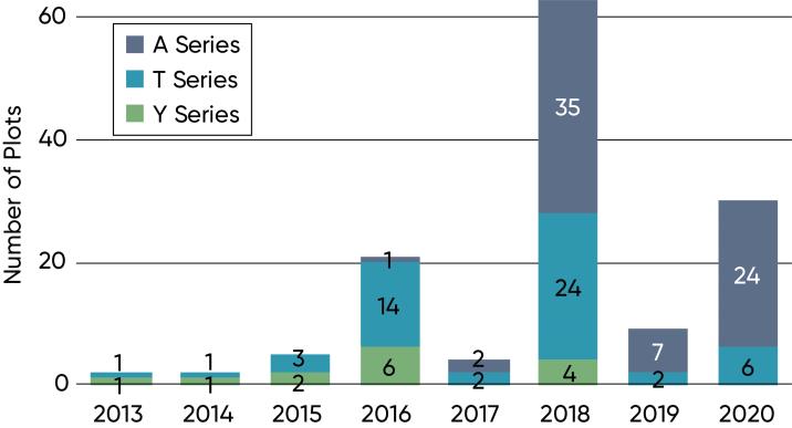 Figure 2. Series of Pioneer brand soybean varieties used in Eastern Canada Pioneer on-farm trial entries exceeding 75 bu/acre, 2013-2020.