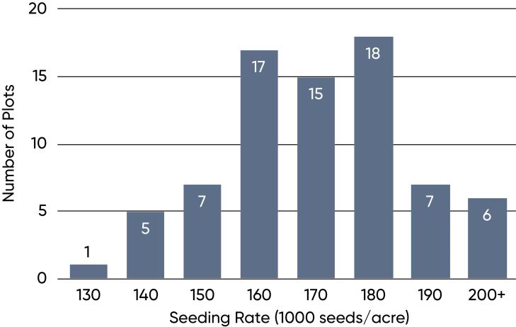 Figure 4. Seeding rate used in Eastern Canada Pioneer on-farm trials with entries exceeding 75 bu/acre, 2013-2020.