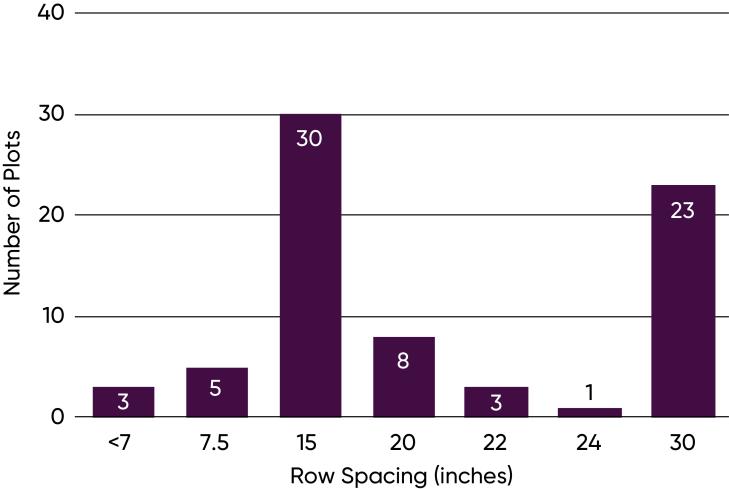 Figure 5. Row spacing used in Eastern Canada Pioneer on-farm trials with entries exceeding 75 bu/acre, 2013-2020.