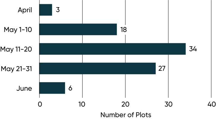 Figure 6. Planting date of Eastern Canada Pioneer on-farm trials with entries exceeding 75 bu/acre, 2013-2020.