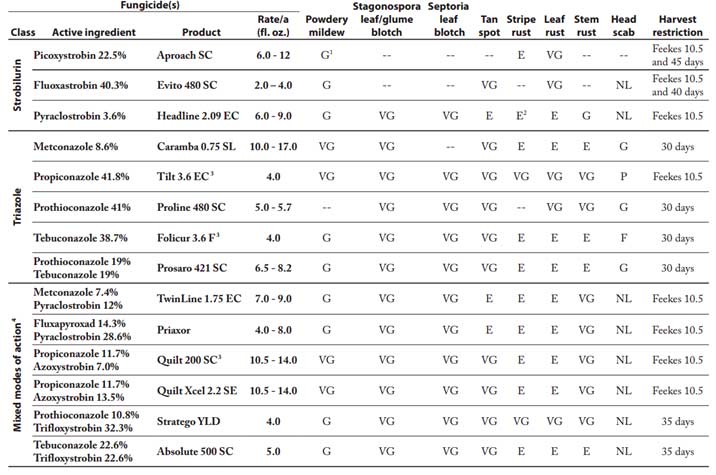 De Wolf, E. 2013. Foliar fungicide efficacy ratings for wheat disease management – 2013. Kansas State University Extension Publication EP130.