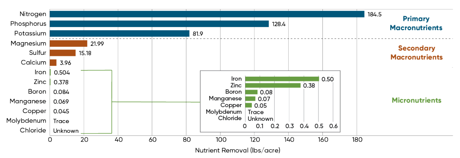Although micronutrient removal rates are increasing, they are still very small relative to the primary and secondary macronutrients. Removal rates for a 300 bu/acre corn crop range from over 80 lbs/acre for the primary macronutrients and 4-22 lbs/acre for secondary macronutrients, compared to 0.5 lb/acre or less for micronutrients.