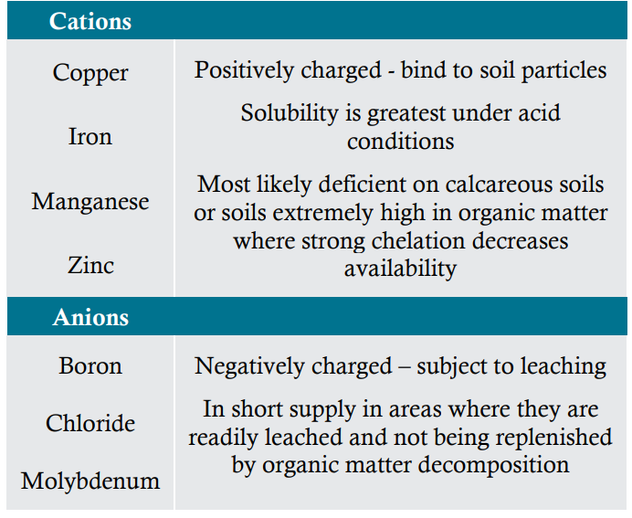 Micronutrients differ in the form they are absorbed by the plant, their functions and mobility in the plant, and their characteristic deficiency or toxicity symptoms (Table 2 and 3).