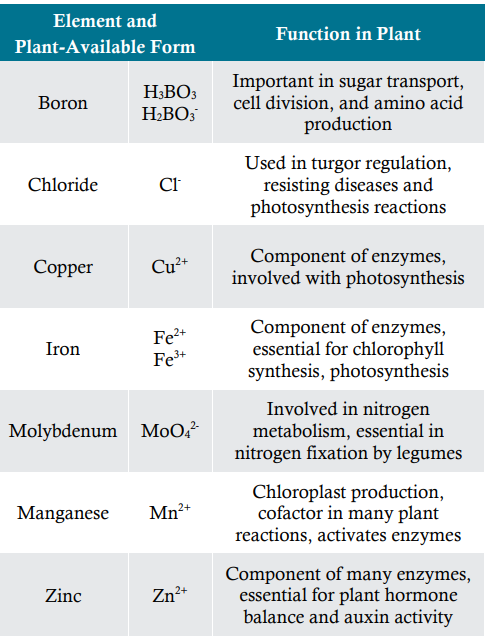 Table 2. Plant available forms and functions of micro-nutrients in plants2.