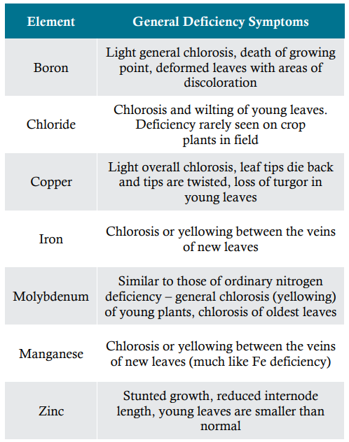 Except for Mo, the micronutrients are considered weakly mobile or immobile in plants. This means that deficiency symptoms appear first or most severely on newest plant tissues. For molybdenum, deficiency symptoms appear first on oldest plant tissues. Symptoms vary according to crop, but generalized symptoms are shown in Table 3.