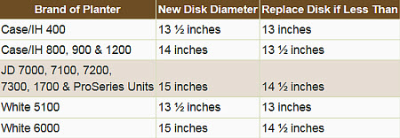 Double disk openers - Test to make sure there is good contact between the double disks. Slide a business card from the top down along the front of the disks until the card won't lower any further. Mark that spot with chalk. Then, take the card from the back and slide it forward until it stops. Mark that spot and measure the distance between the two marks. If it is less than two inches, reship or replace the disks. In general, the disks must be replaced when they loose 1/2 inches in diameter.