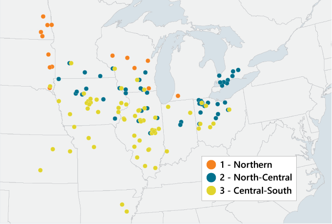 A recent study by Gaspar et al. (2020) pulled together data from a large number of soybean seeding rate field studies to quantify the production risk associated with soybean yield response to seeding rate and plant density from a range of environments across North America. Soybean seeding rate and yield data were compiled from 211 soybean seeding rate field experiments conducted across 12 U.S. states and Ontario, from 2005 to 2017. Cluster analysis was used to group field studies into similar growing environments based on GPS coordinates, soil characteristics, and weather variables. This analysis grouped research locations into three clusters with distinct latitudinal separation, with one cluster comprised of northern Corn Belt locations, one that covered many of the central Corn Belt and southern locations, and one between the two that partially overlapped both (Figure 1).