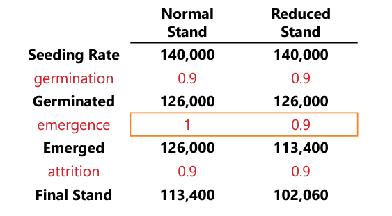An important consideration in soybean seeding rate decisions is the fact that the plant density of a stand of soybeans at the end of the season will often be considerably less than the number of seeds that went into the ground. Soybeans naturally undergo some amount of plant attrition during the growing season, so the number of plants per acre at the end of the season will not equal the number of plants that emerge. This is important when targeting a minimum final stand. The rate of attrition increases with plant density. Research has found that attrition rates of 10 to 20% are typical with current seeding rates. Assuming a 15% attrition rate, an initial plant stand of 120,000 plants/acre at V2 would result in a final stand of 102,000 plants/acre.