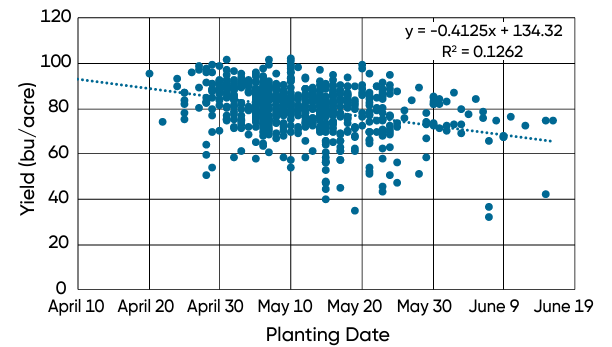 Figure 4. Soybean yield by planting date from four years of on-farm trials in Nebraska and Kansas (Propheter and Jeschke, 2017).