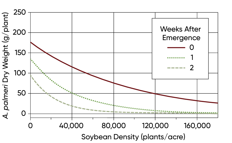 A field research study on the effects of soybean plant density on the growth of Palmer amaranth (Amaranthus palmeri) showed that plant density can have an important effect on weed growth and seed production. The study found that both biomass (Figure 5) and seed production (Figure 6) of Palmer amaranth increased as soybean density decreased. The impact of soybean plant density was greater the earlier the Palmer amaranth plants emerged relative to the crop.