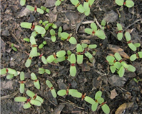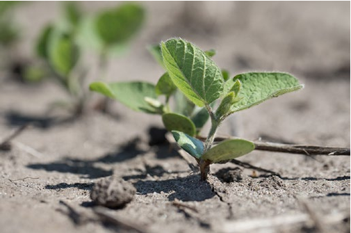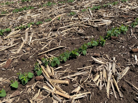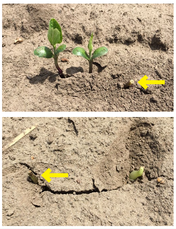 Figure 3. Emerging soybeans in dry, crusted soil at the Johnston Field Research Center in 2018, showing some seedlings that broke off during the emergence process.