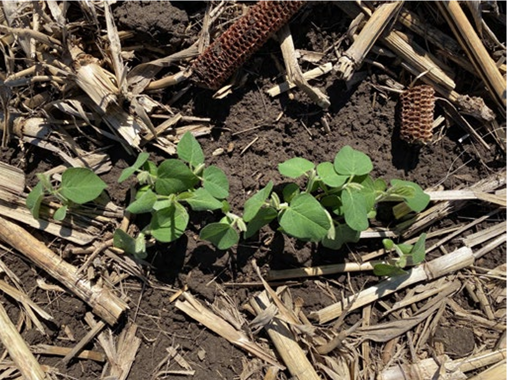 Figure 3 shows a scenario in which weather conditions following planting impacted soybean stand establishment at the Corteva Agriscience research center at Johnston, IA. The field experienced heavy rain after planting followed by an abrupt transition to hot and dry conditions, resulting in soil crusting. As the soil dried out, many later-emerging soybean seedlings were unable to pull their cotyledons free from the soil and snapped at the hypocotyl. Soybean stand loss was around 10%. The seeding rate in this field was 140,000 seeds/acre. Assuming a 90% germination rate and 10% plant attrition during the season, early season stand loss likely reduced final stand in this field to just above 100,000 plants/acre.