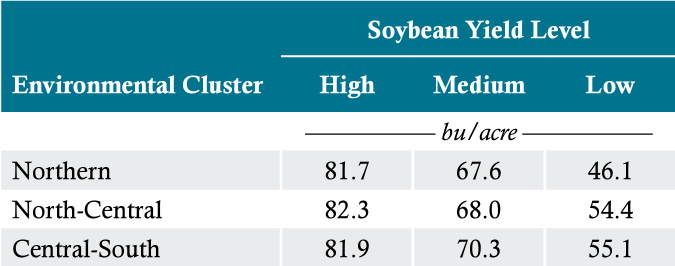 Although the yield level groupings spanned a wide yield range in all three environmental clusters, all yield level groupings were relatively high, reflecting the fact that field studies tend to be conducted in high productivity environments. For example, the low, medium, and high yield group averages for the Northern cluster were 46.1, 67.6, and 81.7 bu/acre, respectively. The average soybean yield as reported by USDA-NASS for the states represented in this cluster over the years of the study period was only 40 bu/ acre.
