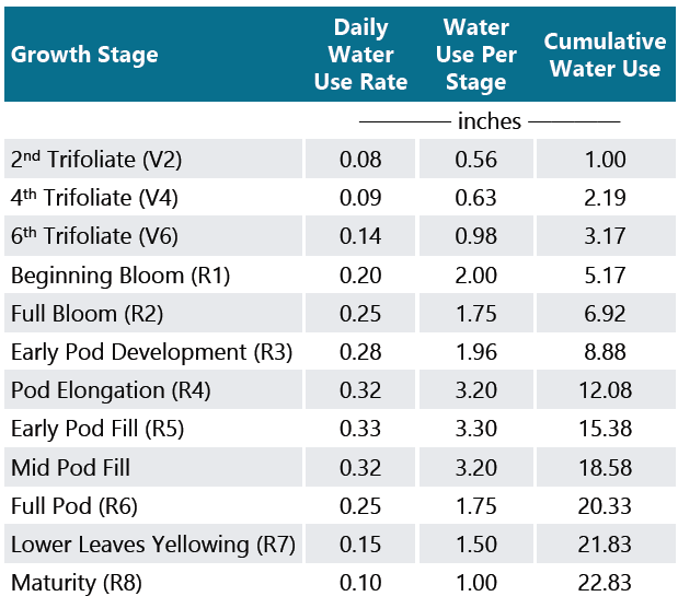 Table 1. Average daily soybean water use (ETc), water use per growth stage, and cumulative water use over the course of the growth season.