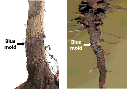 Figure 2. Root and stem of soybean plants with blue Fusarium virguliforme fungal colonies present at soil surface line.