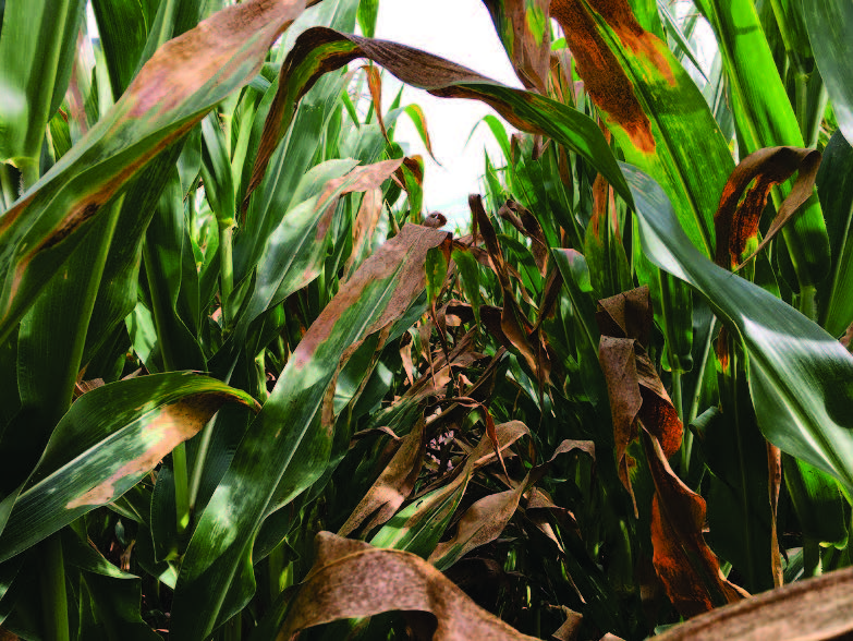 Closeup of sunscald injury on a corn leaf, showing injured tissue between the leaf veins.
