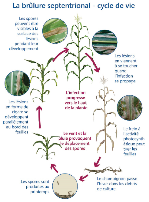 - Exserohilum turcicum passe l’hiver dans les résidus de maïs. Cela permet à l’inoculum de s’accumuler d’année en année.