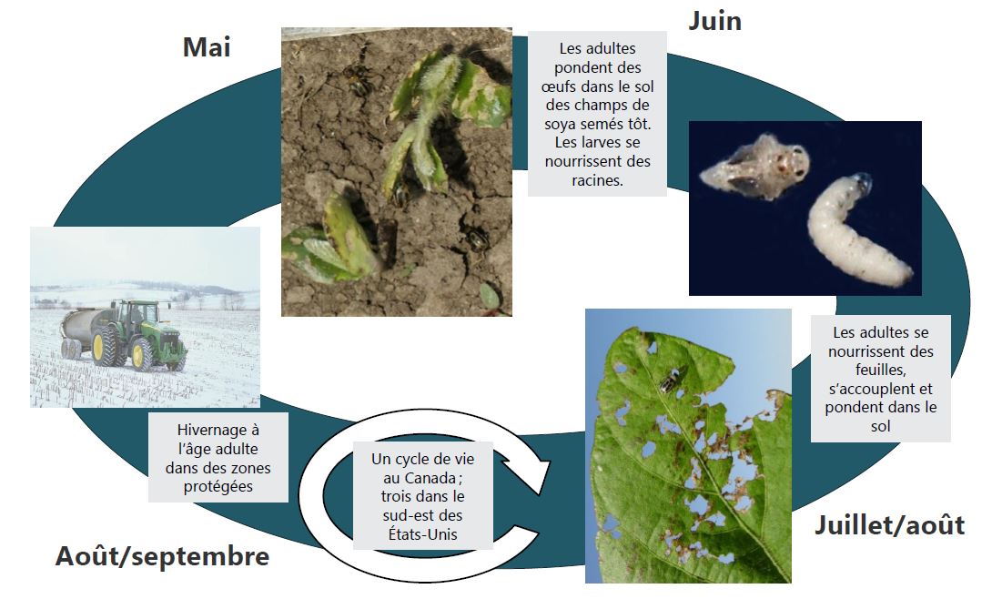 Bien que les larves se nourrissent des racines du soya, les adultes causent la plupart des dommages en se nourrissant du feuillage ou des gousses