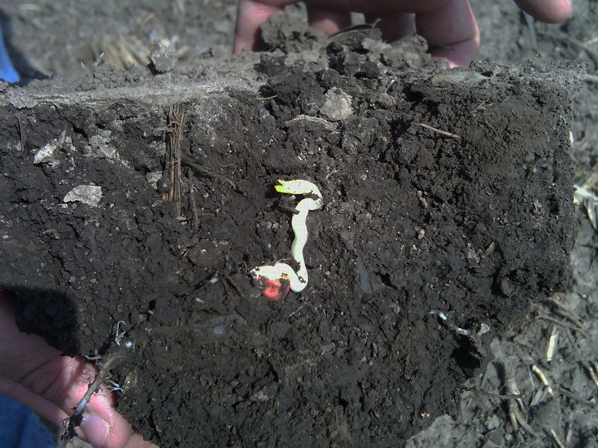 Figure 1. Plantule de maïs qui n’a pas réussi à lever en raison d’un stress prolongé au froid et des conditions de sol compactées. Le coléoptile n’a pu percer la surface du sol. Il est donc tordu et difforme.