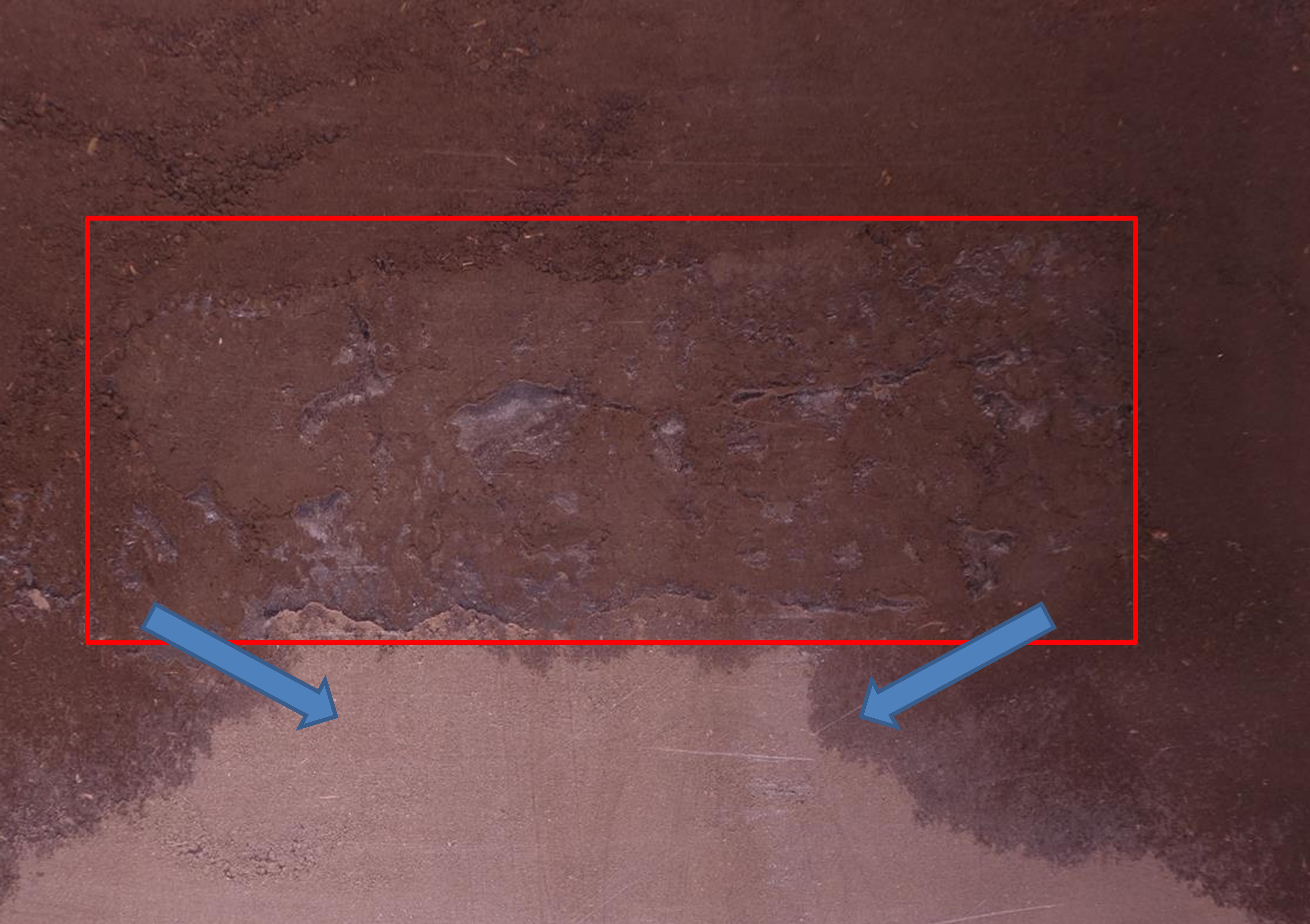 Figure 4. Une zone de sol fortement compacté (délimitée par la boîte rouge) limite l’écoulement de l’eau à travers le profil du sol. L’eau s’écoule plus rapidement à travers un sol moins compacté. Elle commence finalement à se déplacer sous la zone de forte compaction (Strachan et Jeschke 2017).