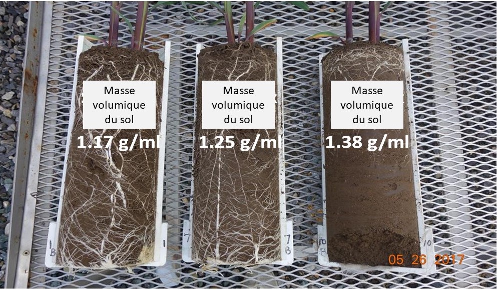 Figure 3. Croissance racinaire de plants de maïs (stade de croissance V5) poussant dans un sol compacté à différentes masses volumiques avant que les semences de maïs ne soient semées (Strachan et Jeschke 2017).