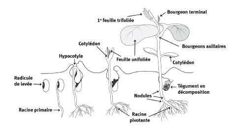 La croissance du soya comprend différents stades divisés en croissance végétative (V) et en croissance reproductive (R). Exception faite des deux premiers stades désignés par VE (levée) et VC (stade cotylédon), la croissance végétative est subdivisée en stades V (ex. : V1, V2, V3, jusqu'à V(n)). Le dernier stade V est désigné par V(n) où (n) représente le numéro du dernier stade nodal de la variété en question. Le stade (n) fluctuera en fonction de la variété et des différences environnementales. Les stades végétatifs et les stades reproductifs sont désignés numériquement avec leurs noms communs dans le tableau 1.