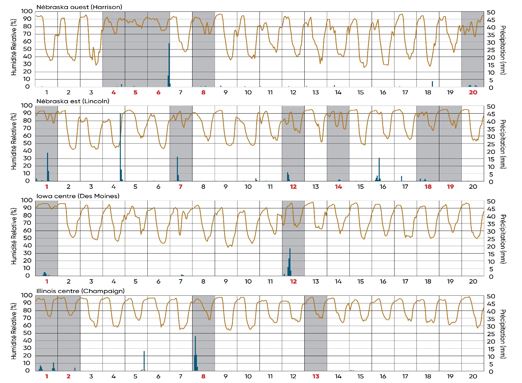 Figure 5. Humidité relative horaire et précipitations pour quatre sites du 1er au 20 juillet 2023. Les jours en gris sont ceux où l’émission de pollen a pu être réduite par des conditions pluvieuses ou une humidité élevée (>70 %). Données provenant des stations de surveillance du réseau de référence climatique américain NOAA NCEI.