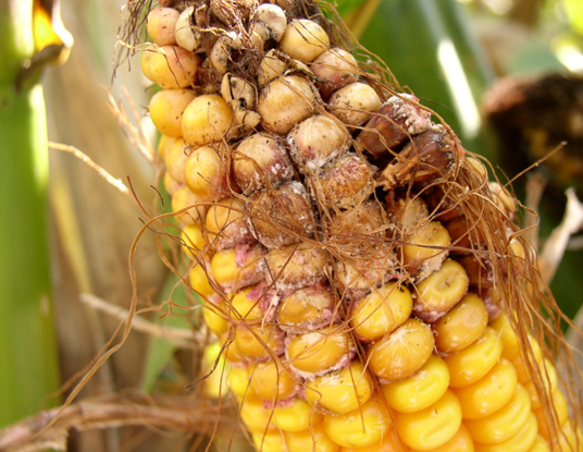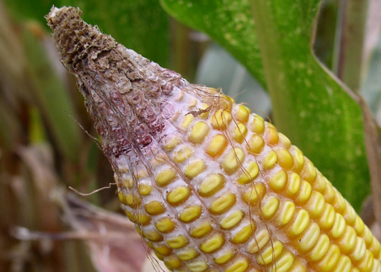 - Les épis infectés tôt peuvent pourrir complètement. Les spathes adhèrent fortement à l’épi. La moisissure croît entre les spathes et l’épi.