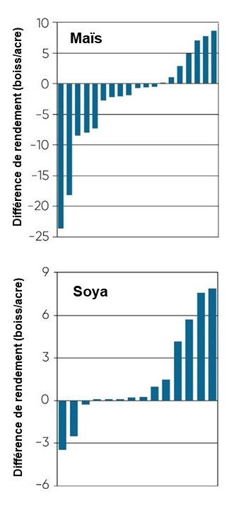 Figure 10. Réponse du rendement en maïs et en soya à une culture de couverture de seigle céréalier dans un essai à la ferme en Iowa sur quatre ans. Chaque barre représente l’effet sur le rendement de la culture de couverture à un endroit donné, pour une année donnée. Les résultats sont tirés de Carlson (2013).