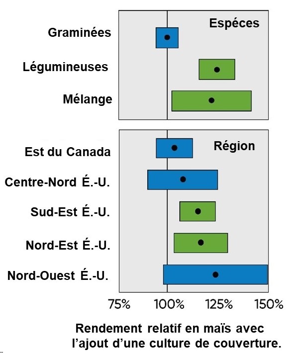 Figure 9. Réponse du rendement du maïs à la culture de couverture hivernale selon l’espèce de culture de couverture et la région. Les points noirs indiquent la réponse moyenne du rendement. Les barres représentent la plage de réponses du rendement. Les résultats sont tirés de Miguez et Bollero (2005).