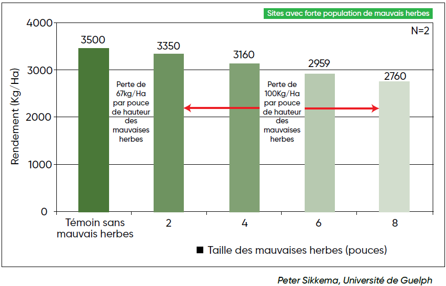 Selon Peter Sikkema, professeur à l’Université de Guelph, les pertes de rendement du soya sont importantes lorsque la densité des mauvaises herbes est élevée, les mauvaises herbes de 2 pouces entraînent des pertes de rendement de 121 Kg/Ha. Les quelques pouces suivants entraînent une perte supplémentaire de 100kg/Ha pour chaque pouce de hauteur des mauvaises herbes. Lorsque les mauvaises herbes atteignent une hauteur de 8 pouces, la perte de rendement est de 740 Kg/Ha inférieur à la parcelle témoin.