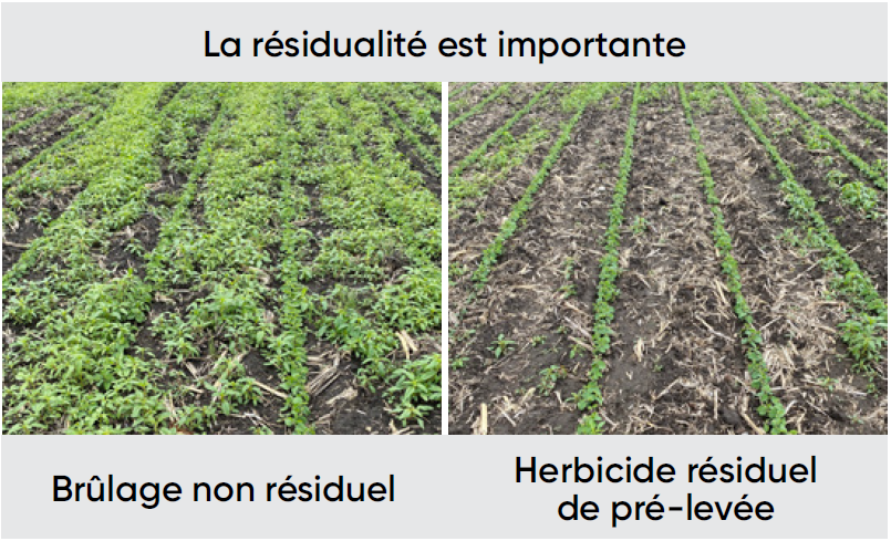 Comme pour le maïs, le soya a une période critique d’absence de mauvaises herbes. Pour un rendement optimal, le soya doit être exempt de mauvaises herbes jusqu’au stade V3 de la croissance du soya. Les herbicides résiduels de pré-levée éliminent les mauvaises herbes avant qu’elles compétitionnent la culture, y compris les mauvaises herbes à levée continue ou à levée tardive.