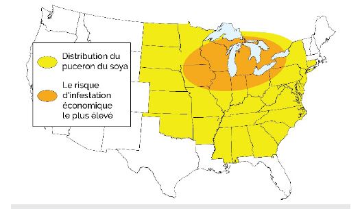 Distribution du puceron du soya et zone de probabilité accrue d’infestation économique.
